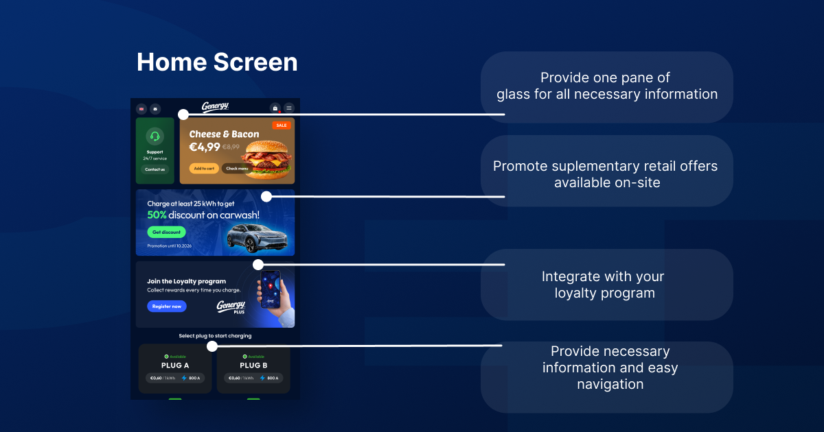 Depending on the location and surrounding infrastructure, the home screen can display own brand promotions, partner advertising, dynamic banners, or time based campaigns. Content can be adjusted throughout the day, aligned with traffic patterns, or tailored to specific sites. This creates new non energy revenue streams and allows retailers to actively engage drivers during the charging session.
