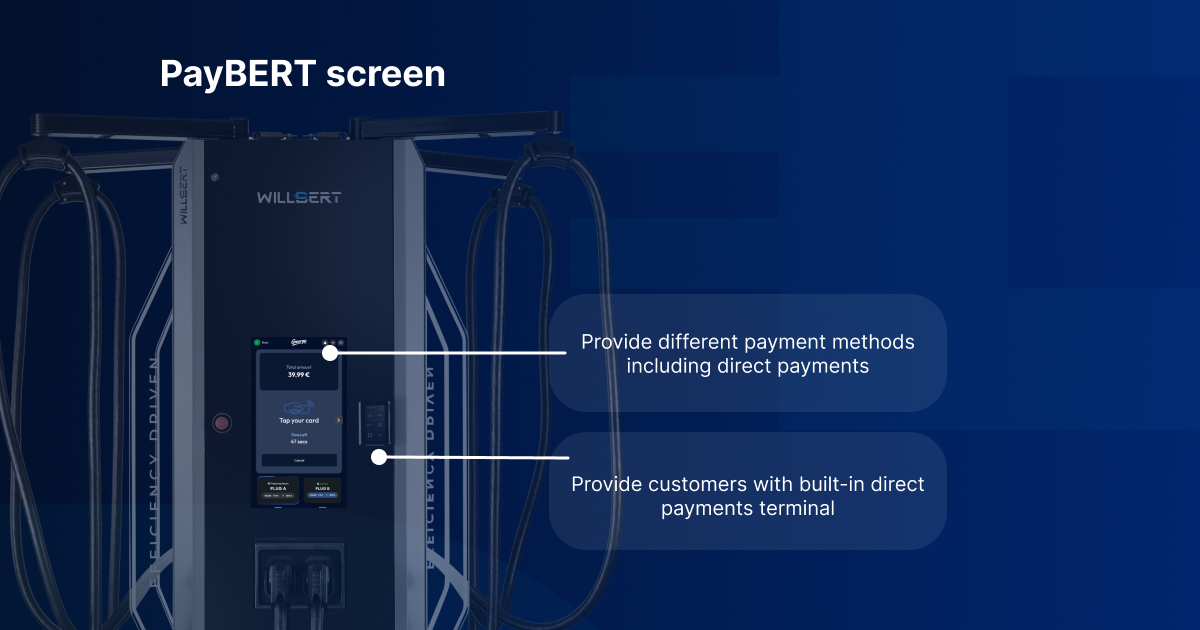 PayBERT addresses this challenge directly. Integrated into the WILLBERT User Interface, it enables seamless, app free payments using bank cards. Drivers can easily define a session budget and maintain full control over costs, while benefiting from real time pricing and transparent invoicing. Additionally, it handles remote authorizations, fleet cards, or RFID. PayBERT fully meets European regulatory requirements and supports AFIR compliance where applicable.