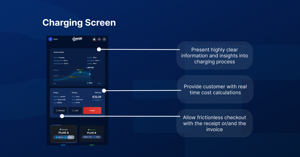 For EV drivers, this means a clear, intuitive and engaging journey from the very first interaction. Plug selection, session start, charging progress, power delivery, energy consumption, and costs are presented transparently and in real time. The result is a stress free charging experience that feels easy to consistent.
