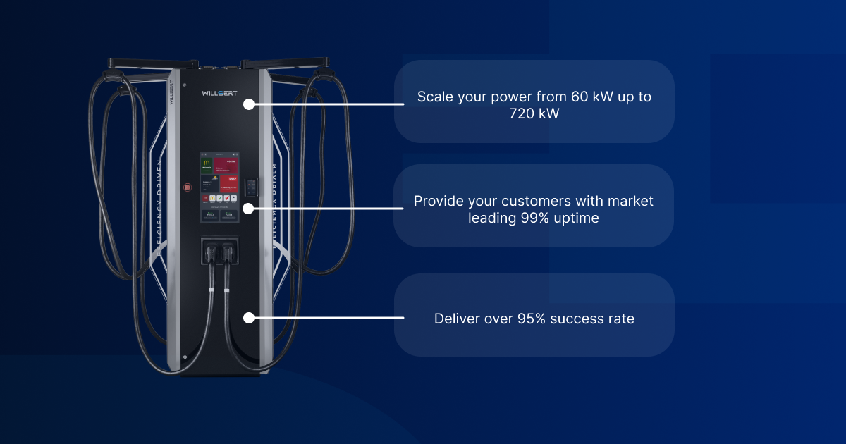 The software ecosystem is supported by a robust and future ready hardware platform. WILLBERT is a European manufacturer specializing in high power DC charging solutions designed for retail integration and scalable deployment.
