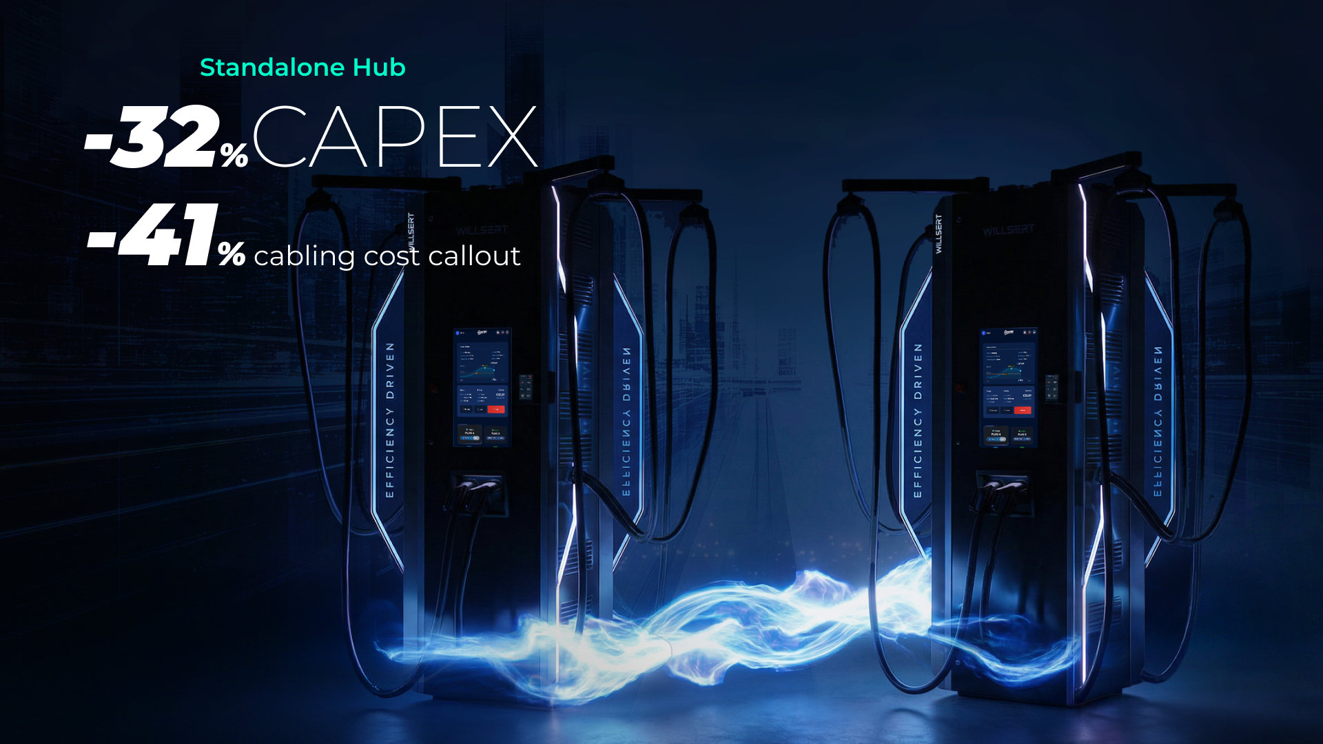For operators deploying 8-plug sites at retail locations, switching from standalone chargers to WILLBERT's S-HUB architecture delivers a compelling set of improvements: 32% lower CAPEX, 40% less grid capacity required, higher per-plug peak power, better power utilisation, and a built-in upgrade path to 720 kW. All is achievable with a simpler installation.